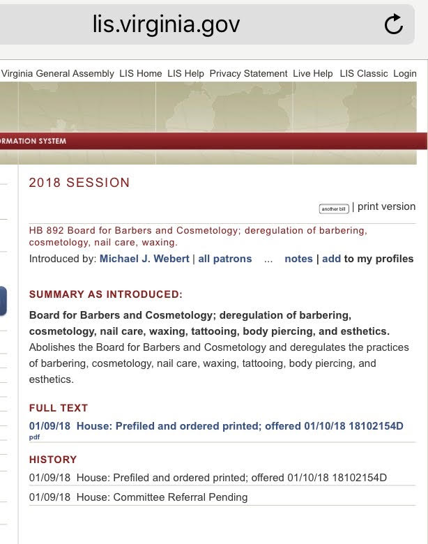 Current Events Covid-19 Regulations, Guidance, and ResourcesBoard for Barbers and CosmetologyResources for Licensees during COVID-19 OutbreakLast updated 9/21/2020 Phase Three Guidelines to Further Ease Public Health RestrictionsVirginia entered Phase Three on July 1, 2020 GUIDANCEWhere a mandatory business requirement in the guidelines conflicts with a requirement to wear a face covering, the sector-specific business requirement takes precedence. EXECUTIVE ORDERSDPOR-regulated businesses affected by the provisions of Executive Order 67 include: Rebuild VA grant program available to help small businesses disrupted by COVID-19. Refer to our main COVID-19 page for best practices and other resources regarding preventing transmission of COVID-19. Board Regulations: Sanitation and Safety StandardsDisinfection Reminders for Spas, Salons, and Shops Cosmetology, Barbering, Nail Care, and Waxing - https://law.lis.virginia.gov/admincode/title18/agency41/chapter20/section270/ Esthetics – https://law.lis.virginia.gov/admincode/title18/agency41/chapter70/section270/ Body Piercing - https://law.lis.virginia.gov/admincode/title18/agency41/chapter60/section200/ Tattooing - https://law.lis.virginia.gov/admincode/title18/agency41/chapter50/section400/Please note that all licensees are required to take sufficient measures to prevent transmission of communicable or infectious diseases, and must comply with sanitary requirements provided for in the Board’s regulations, or any local, state, or federal law or regulation governing the standards of health and sanitation for their respective practices. Will Virginia Vote to Deregulate Cosmetology ?HB 892 introduced in Virginia Legislature